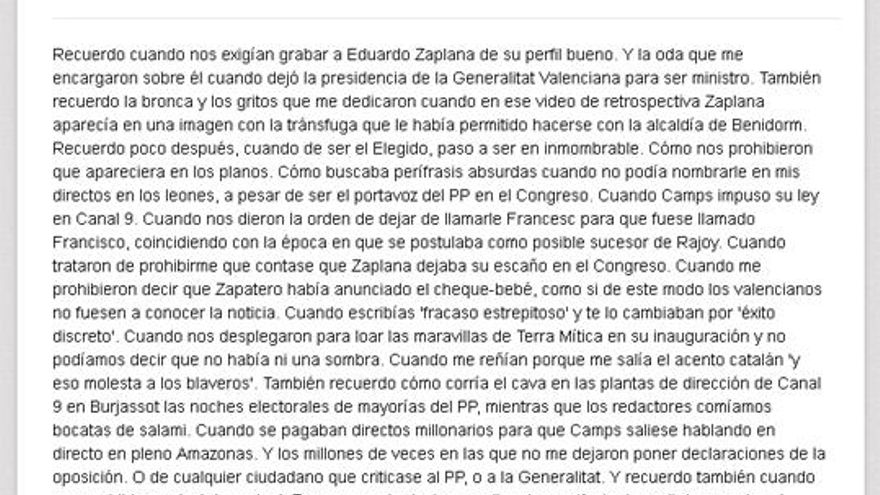 Zaplana, es uno de los grandes protagonistas del relato de la periodista. “Recuerdo cuando nos exigían grabarle de su perfil bueno”, comienza el post.
