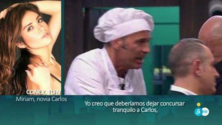 Unas declaraciones que no gustaron a la actual pareja del presentador, la joven modelo Miriam Saavedra, que salió en defensa de su chico en una conexión telefónica con un redactor del 'Deluxe'. Miriam pidió que se deje “concursar tranquilo a Carlos, porque lo está haciendo muy bien, y no meter a gente 'cizañosa' ni gente que únicamente quiere causar daños”.