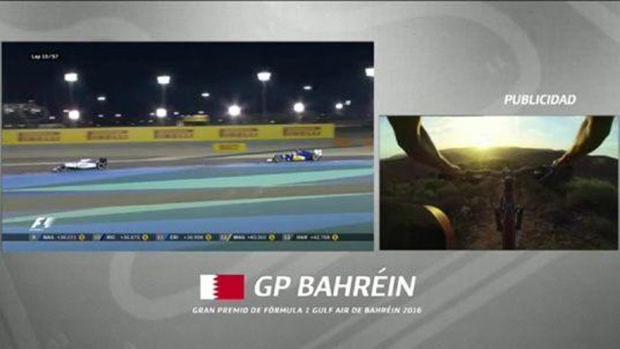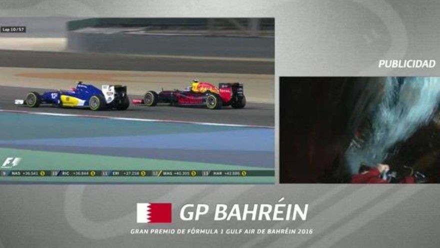 Tanto en la vuelta 10 como en la 54 del GP de Bahrein, Movistar+ introdujo anuncios durante la carrera. Lo realizó de la misma manera que solía hacerlo Antena 3: con una “pantalla partida” en la que la competición reducía su tamaño para ofrecer al lado el anuncio, y además con el audio de la publicidad. Así puede verse en esta captura.