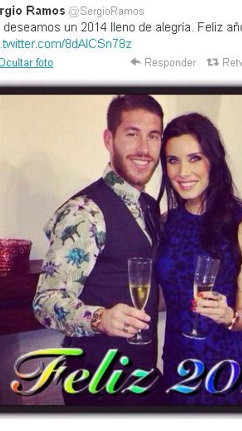 Foto noticia El brindis de Pilar Rubio y Sergio Ramos con su camisa de dinosaurios La pareja compartió esta instantánea en Twitter para “desear un 2014 lleno de alegría” a todos sus seguidores. Ella embarazada y el look del madridista llamó la atención en la red 2 de enero de 2014 13:15 h Etiquetas / Actualidad / Noticias