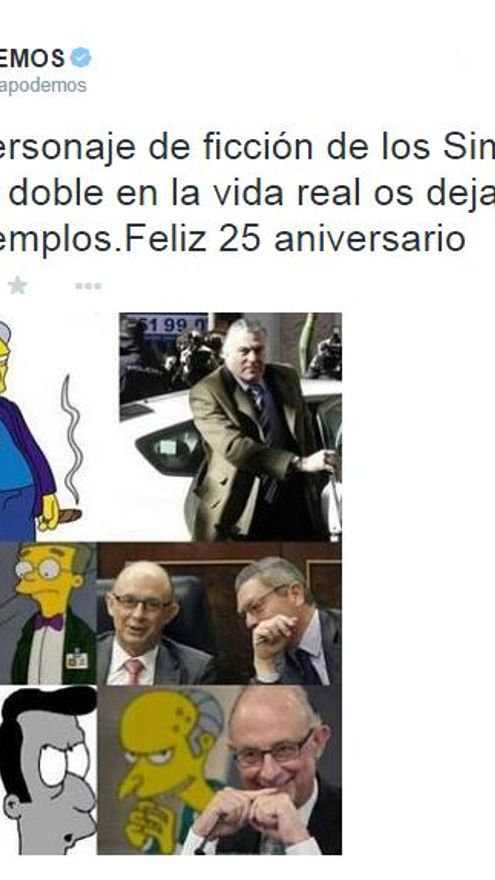 Podemos dio el primer paso felicitando a la popular serie de Matt Groening por sus 25 años y en el mismo tuit aprovechó para recordar que los personajes podrían tener da propia en el Partido Popular: Bárcenas como el mafioso Tony El Gordo D'Amico, Cristobal Montoro con el mismo gesto que el señor Burns y a Ruiz-Gallardón como el ayudante Smithers. Tampoco se han olvidado de Eduardo Zaplana y su parecido con el reverendo Lovejoy.