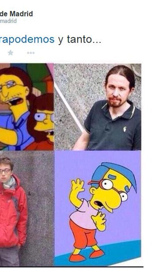 El PP de Madrid les contestó recordando que a algunos miembros de Podemos también se les había sacado el parecido con los personajes amarillos: Pablo Iglesias como un manifestante e Íñigo Errejón y su parecido con Milhouse, el mejor amigo de Bart Simpson.