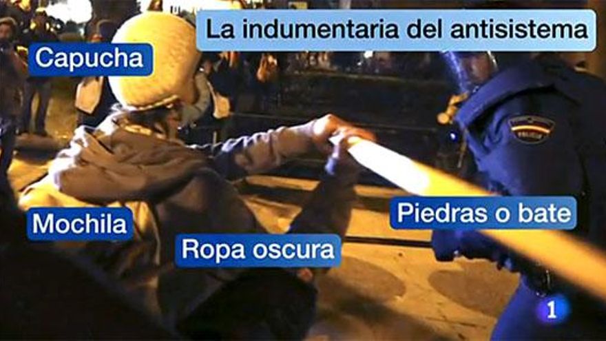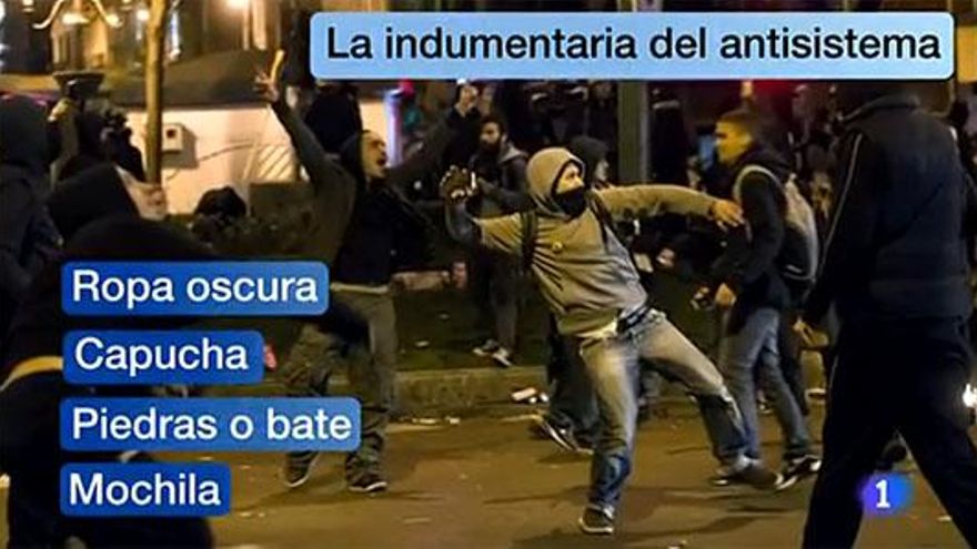 Mientras se muestran imágenes de los altercados, el Telediario deja fija dos imágenes en pantalla con dos de los participantes, mientras la voz en off del periodista explica: “Su indumentaria les delata: ropa oscura, deportiva, capucha en la cabeza, mochila y objetos contundentes en las manos”.