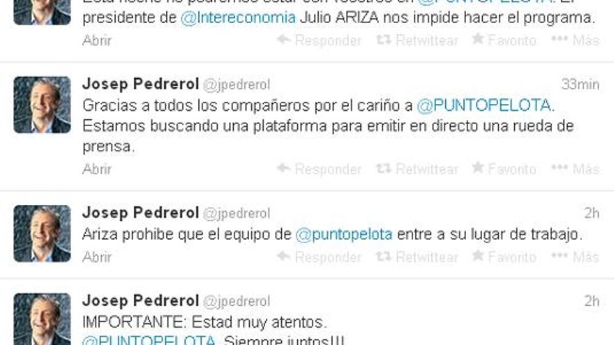 Josep Pedrerol deja de formar parte de Intereconomía. El presentador de Punto Pelota ha sido despedido y le ha sido impedida su entrada en el plató del programa que él mismo producía, tal y como recoge el propio periodista a través de Twitter.