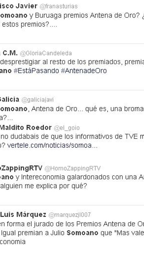 En cuanto se ha comunicado el palmarés de premios, los comentarios sobre el galardón a los servicios de informativos de TVE, dirigidos por Julio Somoano, no se han hecho esperar en Twitter.