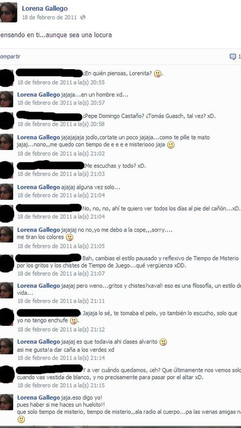 Tras conocerse su nombre, empezó a recorrer las redes sociales una captura del Facebook de Lorena con una conversación que la joven mantiene con un amigo en febrero de 2011, en la que queda patente su pasión por el programa 'Tiempo de Juego', que dice que es “una filosofía y un estilo de vida”.