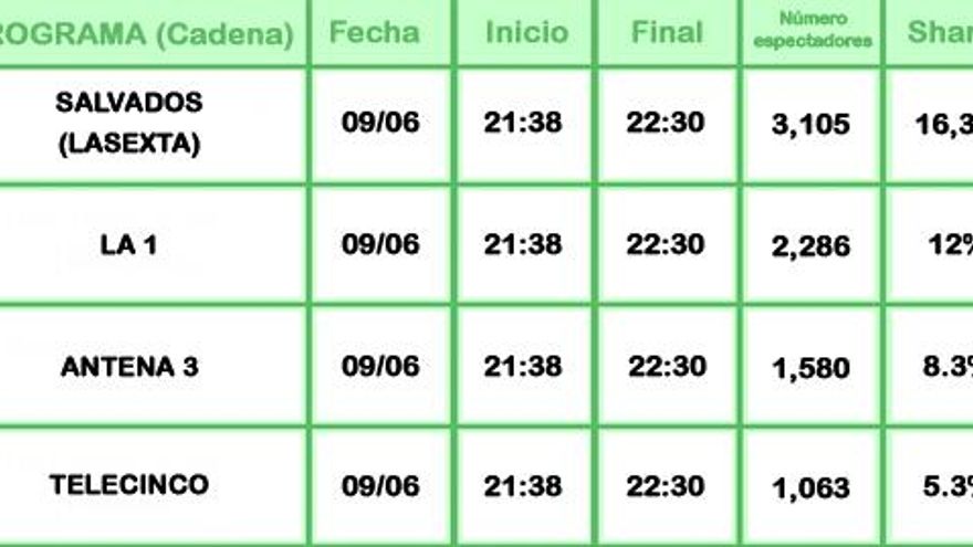Salvados, por tanto, hizo descender -en el caso de Antena 3 y Telecinco de manera especialmente acusada, las audiencias obtenidas por el resto de cadenas. En el caso de Atresmedia, la emisión de El Peliculón permitió repescar a los espectadores perdidos y colocarse como tercera opción de la noche a escasa distancia del cine de La 1; en el de Mediaset, la reposición de la comedia de Alberto y Laura Caballero mantuvo los datos que la cadena había marcado en competencia con Salvados.