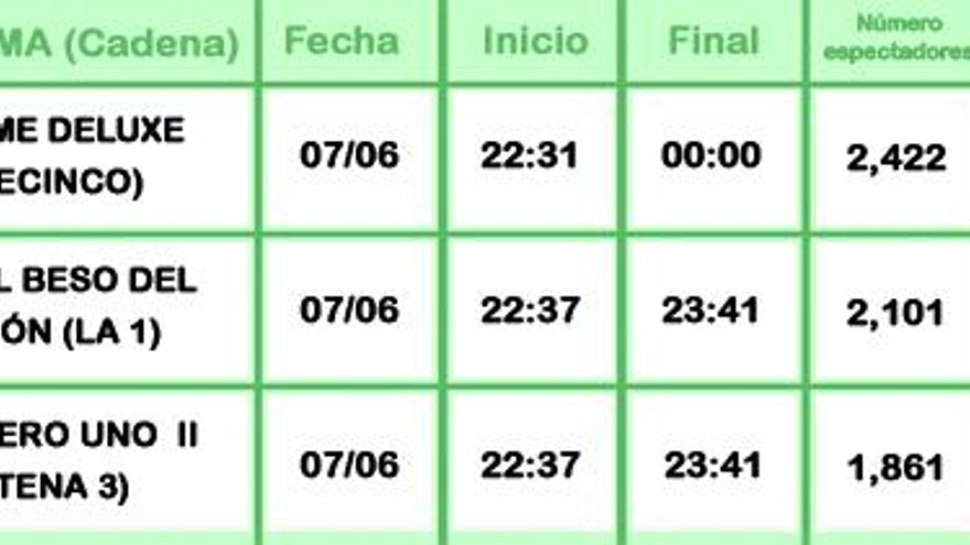 Tomemos como base el día 7 de junio. En aquella ocasión, Deluxe repitió coronando la noche con un 14.6% (y 1.778.135 espectadores), frente al 11,6% (y 1.742.745 televidentes) de su contricante en Antena 3. Los dos programas comenzaron a una hora similar (22:12 en Antena 3, frente a las 22:17 de Telecinco), pero El Número Uno llega a su fin antes, a la 01:06 horas, frente a las 02:20 a la que concluyó el espacio de La Fábrica de la Tele.