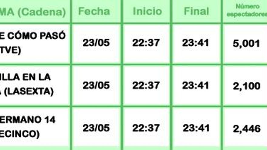 En coincidencia, durante el tiempo que duró la serie de Antena 3 (22:41 a 00:09 horas), los datos obtenidos por TVE fueron un 19,8% y 3,8 millones de espectadores. En este caso, la diferencia entre ambas opciones de programación solo sube muy ligeramente. Hay que tener en cuenta que ambos programas concluían a una hora similar, aunque MasterChef comenzaba unos veinte minutos antes.