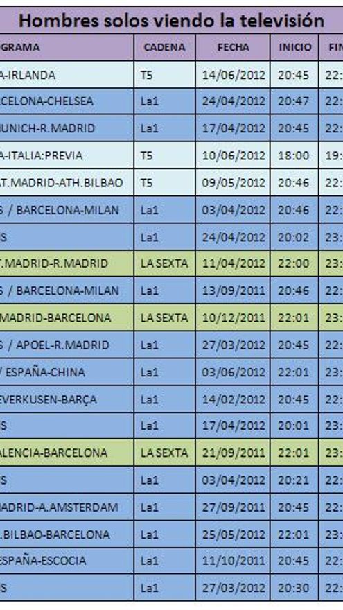 Donde se aprecian más diferencias es en el consumo de televisión en solitario. El género de programación que más capacidad tiene para congregar “solo a hombres” frente al televisor es, como es de esperar, el deporte rey: el fútbol. El ranking de programas más vistos entre los varones que ven solos la TV está copado por competiciones como la Eurocopa, Champions o Liga.
