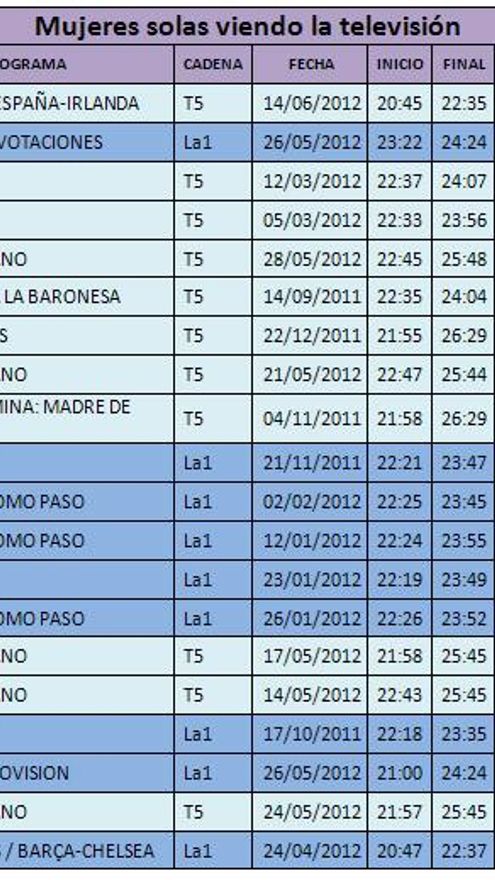 En el caso de las mujeres que ven la TV en solitario, la clasificación es bien distinta. A excepción del España-Irlanda, uno de los primeros partidos de la Eurocopa en los que jugaba la Selección, el resto del ranking lo ocupan otros géneros tradicionalmente femeninos como el reality (Gran Hermano, Acorralados), series españolas (Águila Roja, Cuéntame), tv movies de personajes del corazón (Tita o Mi Gitana, de la baronesa Thyssen y la Pantoja respectivamente), magacines de entretenimiento y cotilleo (Sálvame Deluxe) y eventos como Eurovisión.