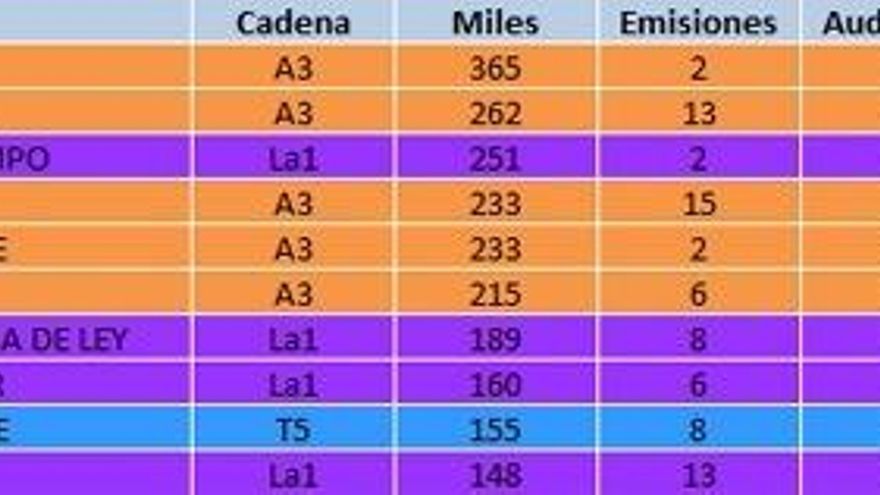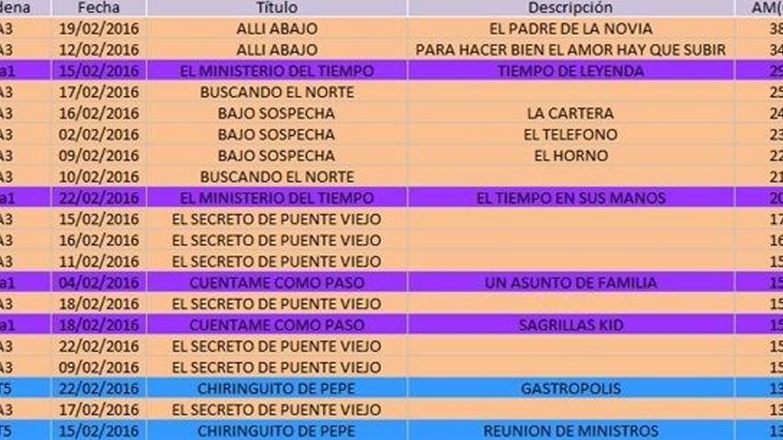 Si atendemos a los últimos datos, solo de febrero, y teniendo en cuenta el liderazgo de 'El Príncipe' aún no computado, Antena 3 copa 14 puestos del top 20 de emisiones más vistas, con dos capítulos de ‘Allí Abajo’ a la cabeza, seguido de 'El ministerio del tiempo'. Le sigue La 1, con dos emisiones de 'El ministerio del tiempo' y otras dos de 'Cuéntame', y Telecinco, con dos de 'Chiringuito de Pepe'.