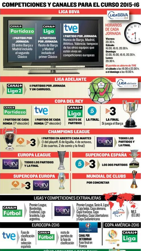 Distintos medios deportivos como Marca y Mundo Deportivo han elaborado trabajados cuadros-resumen con guías para no perderse nada este año futbolístico, que por su claridad y utilidad recogemos a continuación.