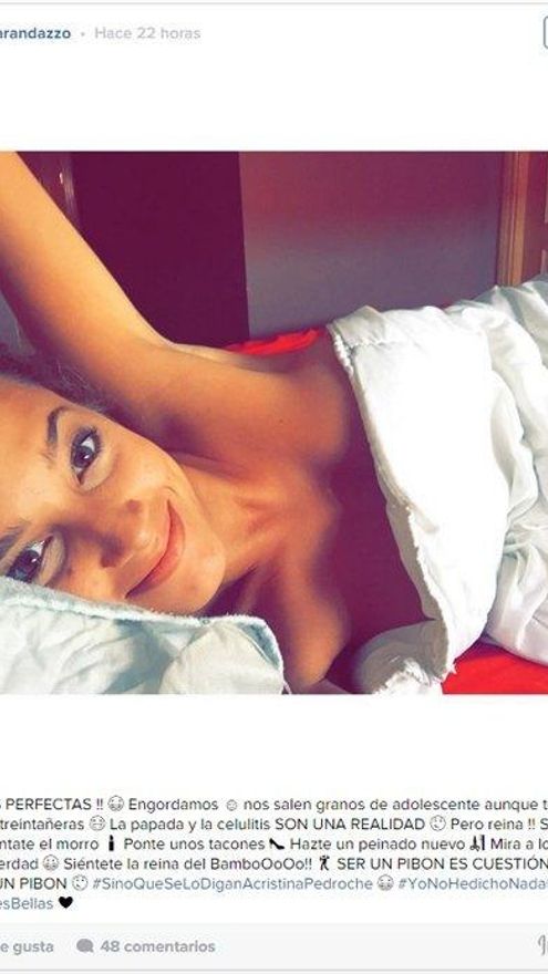 “No somos perfectas. Engordamos, nos salen granos de adolescente aunque tengamos caderas de treintañeras. La papada y la celulitis son una realidad. Pero reina, siéntete guapa, píntate el morro, ponte unos tacones, hazte un peinado nuevo, mira a los ojos, sonríe de verdad y ¡siéntete la reina del mambo! ¡Ser un pibón es cuestión de sentirse un pibón! Si no, que se lo digan a Cristina Pedroche. Yo no he dicho nada. A ser felices, bellas”, escribía Randazzo en redes sociales.