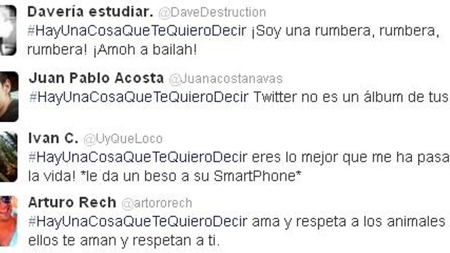 En un momento de la noche el aluvión de tuits que expresaban “aquello que los tuiteros querían decir” fue tal que resultaba difícil encontrar aquellos que se referían al programa en cuestión. Críticas al uso de la red social por algunos usuarios, amor hacia sus aparatos de alta tecnología, canciones o alegatos a favor de la naturaleza: “#HayUnaCosaQueTeQuieroDecir ama y respeta a los animales como ellos te aman y respetan a ti”.