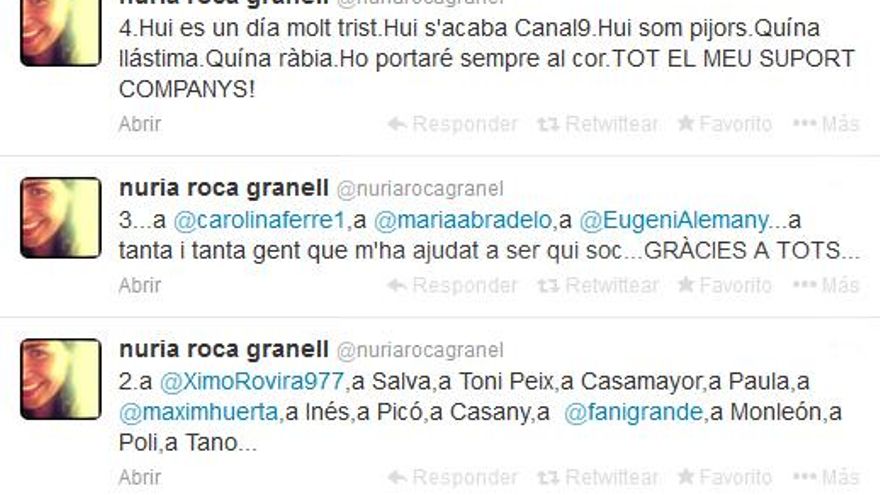 “La primera valoración que quiero hacer es que estoy triste. Desde que me enteré anoche he llorado de pena por la pérdida de algo que forma parte de mi vida, de mi historia. De la vida y de la historia de mi gente. Ha cerrado Canal 9. Escucho la noticia y a mi mente se vienen tantos recuerdos, tantas personas, tantas ilusiones que tengo que respirar hondo para deshacer este nudo que tengo en la garganta.Muchos conocéis mi historia, pero hoy me apetece recordarla. Pisé por primera vez Canal 9 en el año 92 para participar en un concurso y recaudar fondos para el viaje de fin de curso de carrera. Aquel concurso se llamaba ”La sort de cara“ y después de algunos programas saqué el dinero suficiente para el viaje y una oportunidad que me cambiaría la vida. Me ofrecieron hacer una prueba para presentar un programa y allí me quedé.