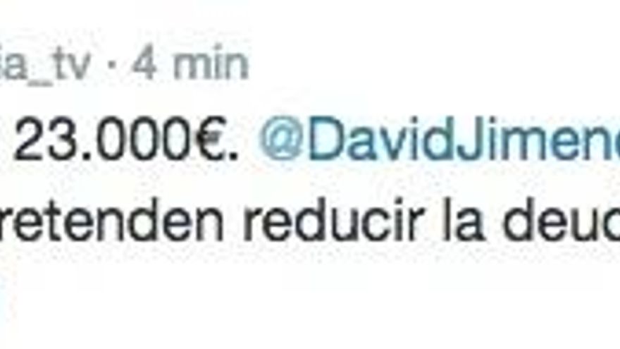 Campo Vidal tenía un lapsus y leía un “Twitter” (y no un tuit) que había enviado David Jiménez, director de El Mundo, en el que hablaba de la deuda pública y el moderador lanzaba la pregunta: “¿Cómo pretenden reducir la deuda pública”