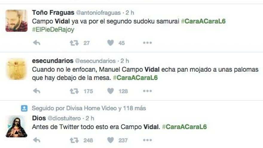 Durante todo el Debate, además, Campo Vidal citó los tuits de algunos periodistas que lanzaron preguntas a los candidatos.