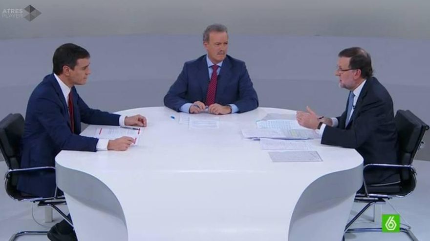 Pedro Sánchez relataba muchas de las propuestas de su programa y Rajoy hacía lo propio, no sin antes corregir lo que había dicho: “Este año ya hemos subido el sueldo a los funcionarios, de manera modesta. Hicimos la reforma laboral, la del sistema financiero, la de FP para un futuro, vamos a facilitar que los contratos temporales pasen a indefinidos...”