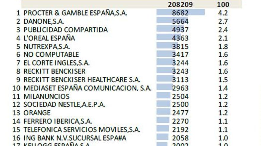 En cuanto a los sectores, la alimentación es el que consigue una mayor presión publicitaria, con un 15.6% del total y 32.522 GRPs. Hasta seis marcas englobadas dentro de esta categoría figuran en el Top 20: Danone, Ferrero, Kellog's, Nestle, Puleva y Artiach.