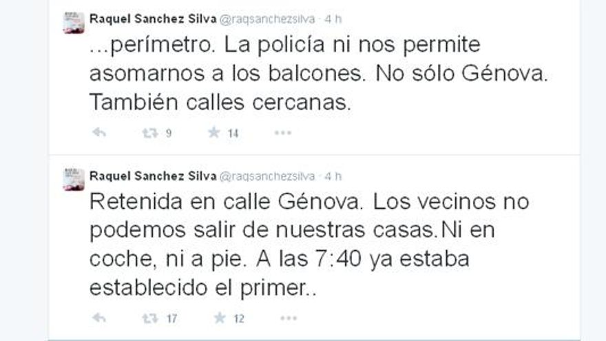 “Buenos días, yo os puedo ofrecer mi testimonio porque soy una de las que esta encerrada en la zona en su casa. Nosotros desde luego no hemos escuchado el golpe cuando el coche se ha estrellado contra la sede del PP, todos los vecinos nos hemos dado cuenta de que algo ocurría porque cuando salíamos hacia nuestros trabajos, yo salía en torno a las 7:40h de la mañana, ya no podíamos salir de las casas, los policías no nos permitían siquiera pisar la calle. De hecho, la gente no es que no pueda sacar su coche es que nosotros no podemos salir”.