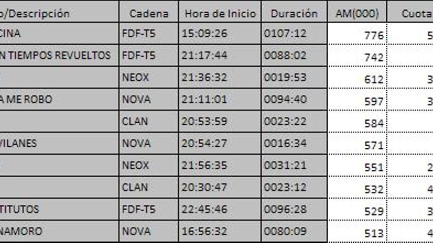 LOS 10 PROGRAMAS MÁS VISTOS DEL DÍA EN LA TDT