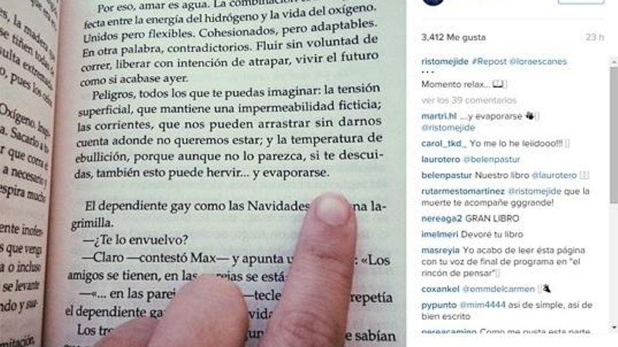 Junto a varios retweets a Mejide, Escanes ha publicado en su Instagram una fotografía de su dedo señalando un párrafo dedicado al amor en 'Que la muerte te acompañe', el tercer libro del presentador de 'Al rincón de pensar'.