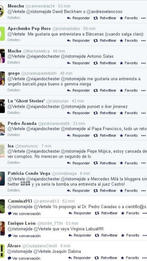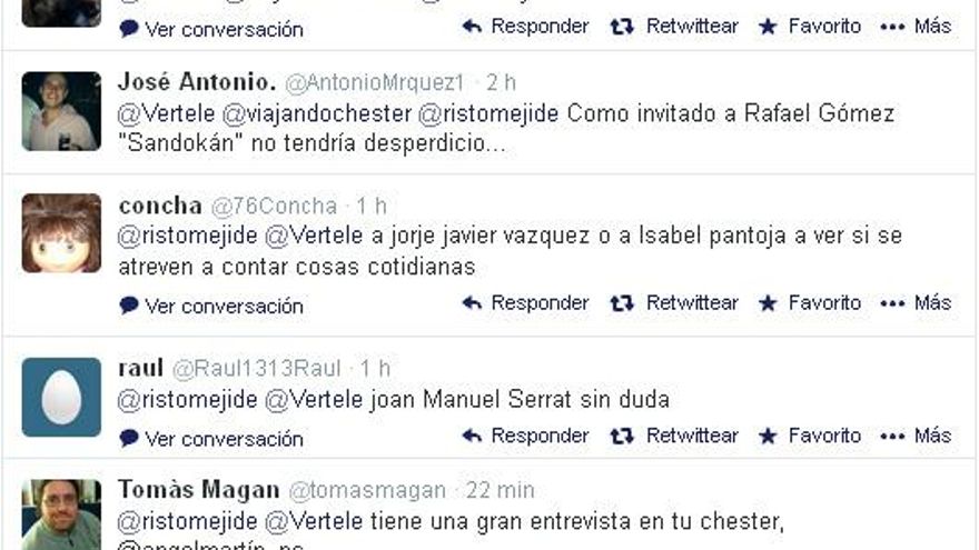 Algunos incluso se atreven con propuestas más arriesgadas: “¡El Papa Francisco, todo un reto!”, o se animan a fomentar la retroactividad del grupo Mediaset: “A Jorge Javier Vázquez o a Isabel Pantoja, a ver si se atreven a contar cosas cotidianas”. Ángel Martín, Mario Conde o Amancio Ortega o Joan Manuel Serrat también reciben “votos”.