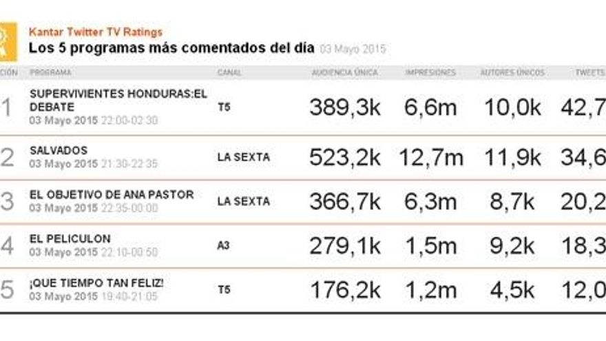Las 'amenazas' de abandono por parte de Elisa y Arantxa en 'Supervivientes' fue lo más comentado de la noche del domingo con más de 6 millones y medio de impresiones y 42.700 tuits. El segundo en el ranking es 'Salvados' con casi 13 millones de impresiones que obtuvo 34.600 comentarios de 12.000 usuarios únicos.