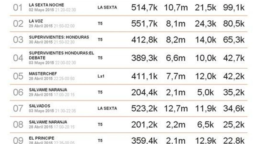 A lo largo de la semana, lo más comentado en las redes sociales ha sido 'La sexta noche' con 99.100 tuits y casi 11 millones de impresiones, seguido de 'La voz' que recogió 80.500 comentarios en la red y 'Supervivientes' con 65.300 tuits y 8 millones de impresiones. 'Masterchef', 'El Príncipe' y 'La que se avecina' también se cuelan entre lo más comentado.