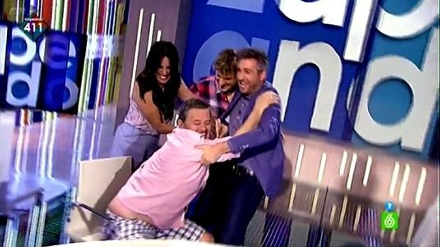 Cada vez que termina el programa de sobremesa de laSexta, el comunicador aragonés tiene la costumbre de levantarse y dar un abrazo a Frank Blanco. Sin embargo, en esta ocasión, eso no ha pasado. El cómico se negaba a levantarse una vez la emisión llegaba a su fin, dejando claro con un gesto que se sentía algo avergonzado. Mientras tanto, el presentador le animaba con guasa a ponerse en pie, y lo mismo los demás compañeros de mesa: Irene Junquera incluso se lanzó sobre Nadal, empujándole para que se incorporara.