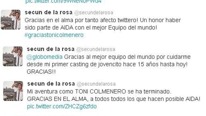 Toni Colmenero dice adiós a Aída. Secun de la Rosa abandona la comedia de Telecinco tras 8 años, tal y como ha informado él mismo desde su cuenta personal de Twitter: “Mi aventura como Toni se ha terminado. Gracias en el alma, a todos todos los que hacen posible Aída! [...]He disfrutado mucho con Toni, pero ha llegado el momento de despedirle con amor!” [...] Gracias en el alma por tanto afecto twittero! Un honor haber sido parte de Aída con el mejor equipo del mundo!“.