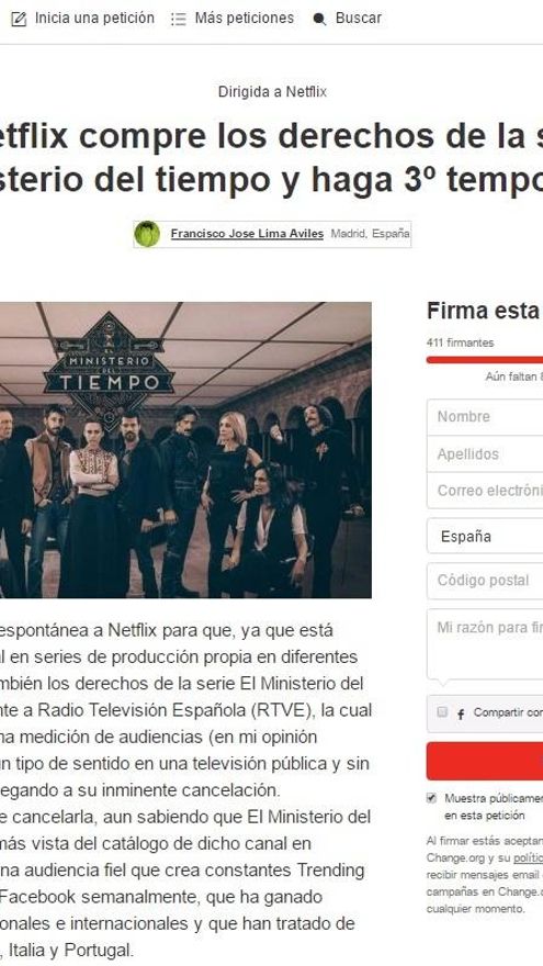 El usuario Franciso Jose Lima Aviles es el promotor de la iniciativa y pide a la plataforma recién llegada a España que “ya que está invirtiendo en series de producción propia adquiera los derechos de 'El Ministerio del Tiempo” que, según él “debido al mal sistema de medición de audiencias está llegando su inminente cancelación”.