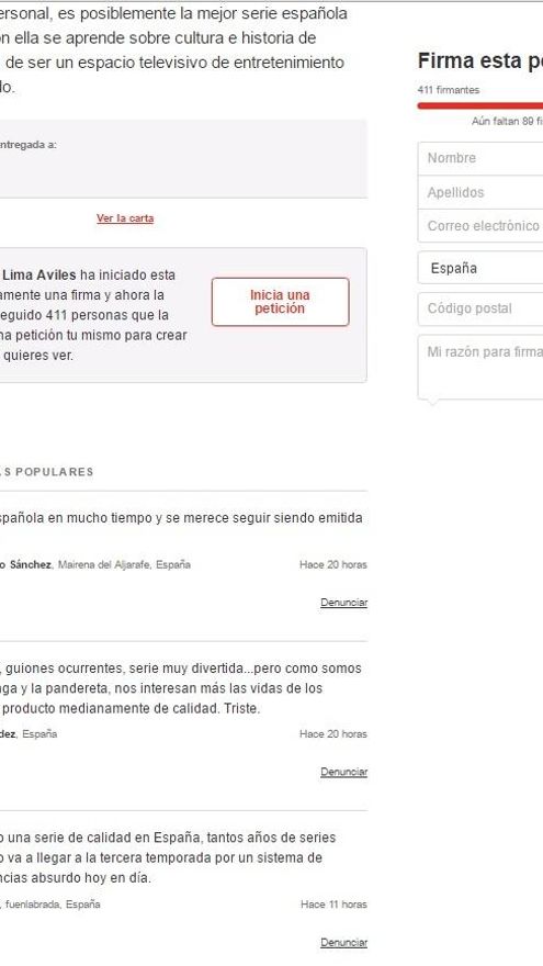 Quieren llegar a las 500 firmas, ya llevan más de 400 y entre los comentarios se puede leer que la ficción protagonizada por Aura Garrido, Nacho Fresneda y Rodolfo Sancho “merece seguir siendo emitida muchos años más” ya que es “Historia de España”.