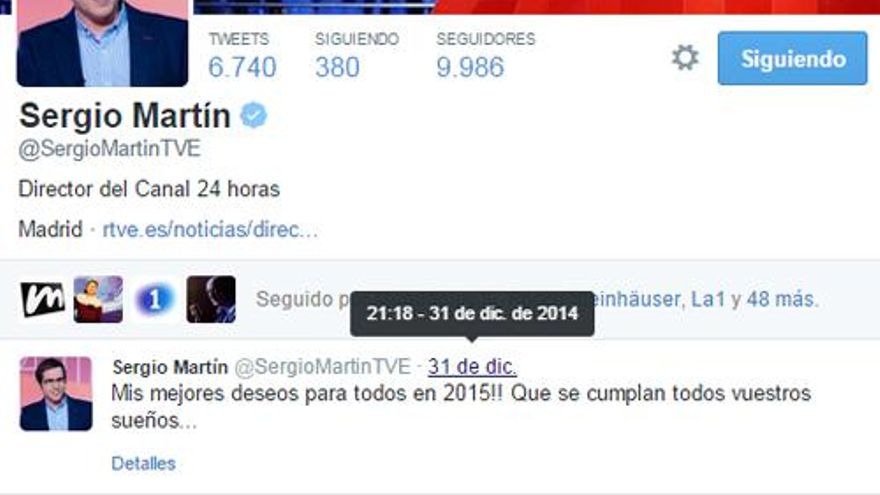 El director del canal 24H rompe su silencio en esta red, 30 días después de su sonada pregunta sobre los presos etarras al líder de Podemos, y dos semanas después de la filtración del audio previo con los tertulianos. Eso sí, lo hace con un discreto tuit, felicitando el año nuevo