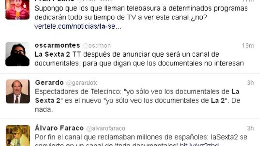 Tras la información publicada por Vertele sobre el nuevo viraje del canal, laSexta 2 se ha alzado como Trending Topic en España en la red de microblogging Twitter. La decisión de apostar por contenidos de tipo documental ha generado, por norma general, opiniones muy positivas entre los twitteros: