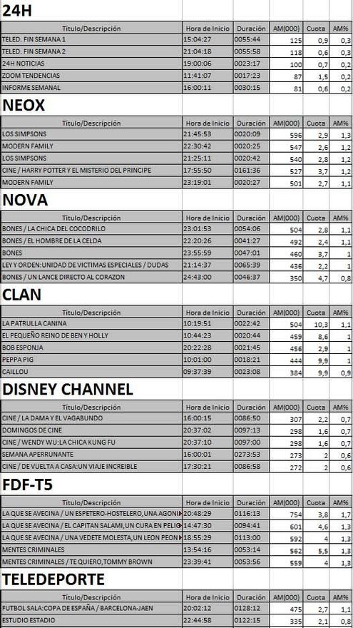 Top 5 programas por cadenas del domingo en la TDT