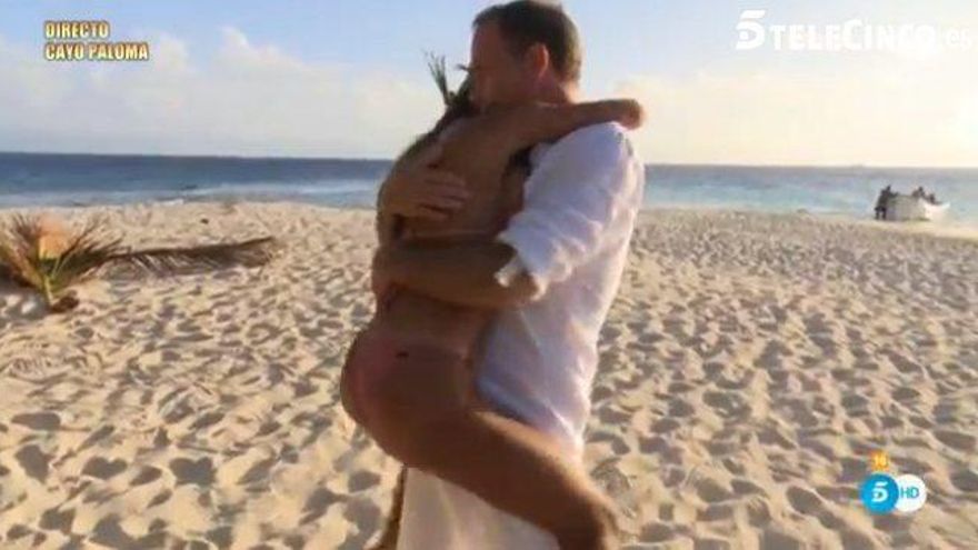 Al encontrarse se fundieron en un abrazo, besos y arrumacos. Ella le decía que todo era muy difícil y él le animaba a volver a España. Dentro de la cabaña había una cena romántica para Carlos y Miriam que finalmente se convirtió en una cena para tres.