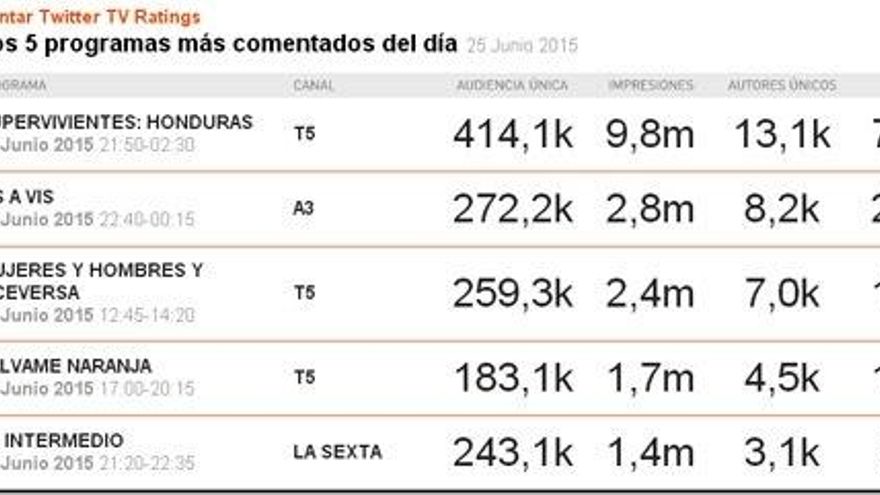 'Vis a Vis' mantiene su segunda posición con 25.300 tuits, mientras Telecinco logra que se cuelen en el ranking otros dos veteranos de la cadena: 'Mujeres y Hombres y Viceversa' (con 15.200 tuits), y Sálvame Naranja (13.800 tuits).