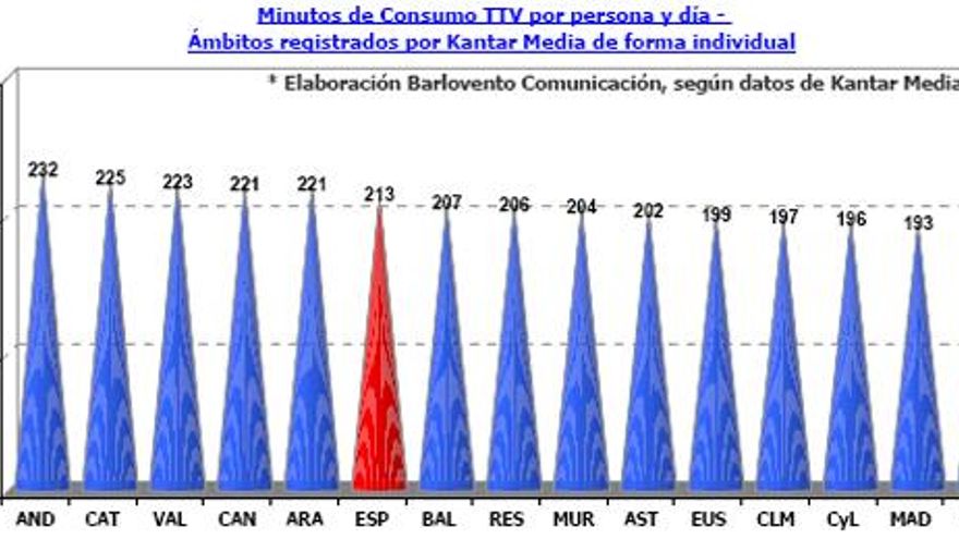Julio promedia un consumo televisivo de 213 minutos por persona al día (3 horas y 33 minutos). La cifra supone 26 minutos menos que el mes anterior y cuatro más que el mismo mes del año anterior. Andalucía y Cataluña encabezan el ranking por comunidades, mientras que Galicia y Madrid son las de menor consumo.