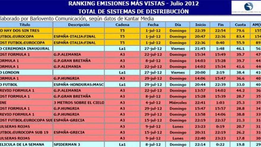 También es la primera opción en todas las jornadas excepto en miércoles y sábado y en las bandas de tarde, “prime-time” y “late-night”. La final y los especiales de la final de la Eurocopa ocupan los primeros puestos del ranking de la cadena. Destaca también el Mundial de Moto GP.