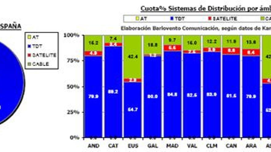 El consumo de TDT (81,3%) sube seis décimas y firma máximo mensual, mientras que el Cable (14,6%) y el Satélite (4,1%) bajan tres décimas cada una. Cataluña es la región que más consume a través de TDT, País Vasco y Asturias las que más lo hacen utilizando el Cable y Canarias el Satélite.