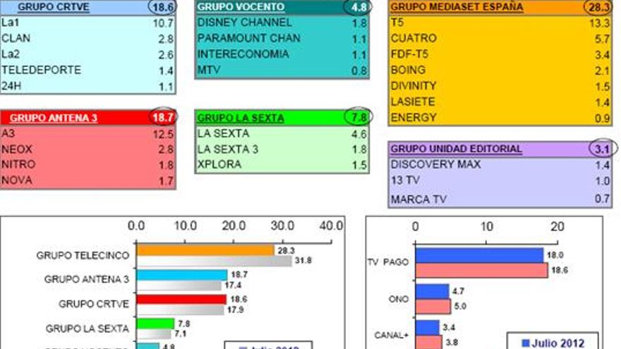 Telecinco (13,3%) baja algo más de tres puntos, pero lidera por quinto mes consecutivo gracias a la final de España-Italia en la Eurocopa. Es la cadena más vista en mujeres, individuos de 25 años en adelante, incluido a los mayores de 65 años, en el target comercial y en los ámbitos de Andalucía, Aragón, Asturias, Baleares, Canarias, Galicia, Madrid y País Vasco.