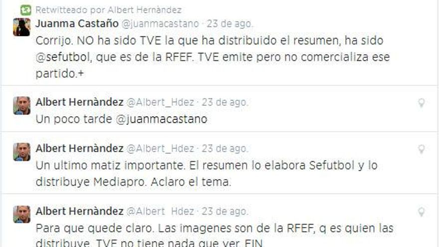 Pero pese a su extensa aclaración, Albert Hernández volvió a dirigirse a él para indicarle que ya era “un poco tarde”, y para dar por cerrado el tema: “Para que quede claro. Las imágenes son de la RFEF, que es quien las distribuye. TVE no tiene nada que ver. FIN”.