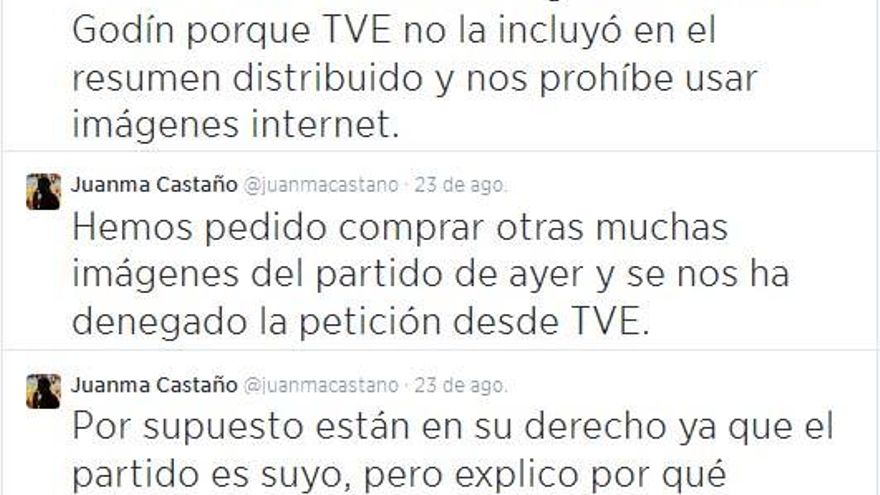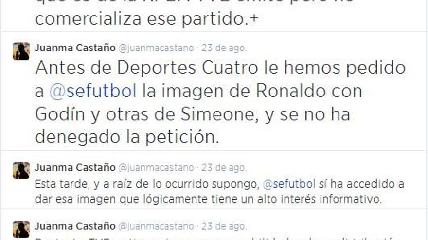 Juanma Castaño, presentador de 'Deportes Cuatro' en la cadena de Mediaset, quiso aclarar que su cadena había intentado adquirir los derechos de esa acción para emitir el lance, pero que le había sido imposible porque TVE les había “denegado la petición” de esa y otras muchas imágenes del encuentro.