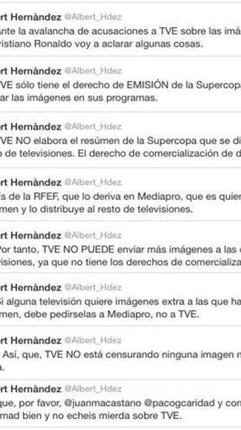 El reportero, que cubre la información deportiva sobre todo del Fútbol Club Barcelona, quiso aclarar que “TVE sólo tiene el derecho de emisión”, que “no elabora el resumen” y que “el derecho de comercialización de dicho resumen es de la RFEF, que lo deriva en Mediapro”.