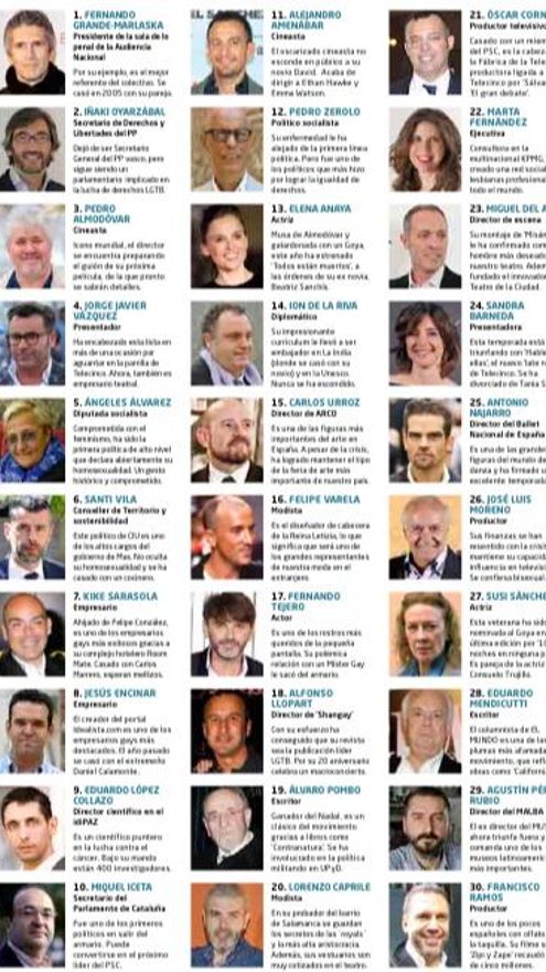 En la mencionada lista, se encuentran el presentador de Telecinco Jorge Javier Vázquez (4º); el actor Fernando Tejero (17º); el productor de La Fábrica de la tele, Óscar Cornejo (21º); la conductora de 'Hable con ellas', Sandra Barneda (24º); el productor José Luis Moreno (26º); el actor de 'Velvet', Asier Etxeandía (33º); el presentador Jesús Vázquez (35º) o el rostro de 'El Programa de AR', Màxim Huerta (44º).