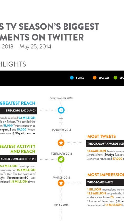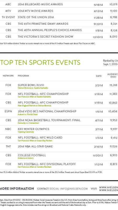 Los Oscar, por su parte, lideran la categoría de eventos especiales y el evento deportivo de la Superbowl se alza con el primer puesto de las competiciones deportivas.