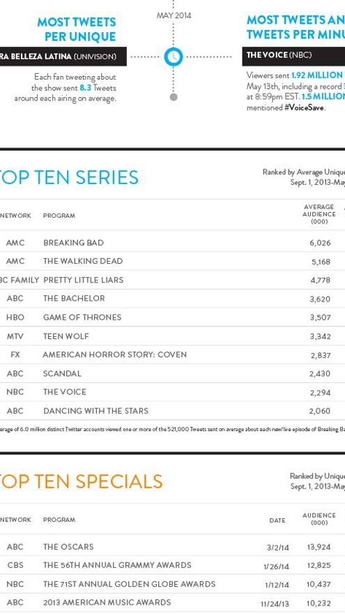 Nielsen, la empresa de información y medios, ha hecho público su primer estudio anual sobre el impacto de la ficción estadounidense en Twitter. La investigación se ha centrado en la temporada 2013-2014 de la televisión americana y ha dado resultados tan esperados como interesantes: Breaking Bad ha sido la serie de TV con mayor impacto en Twitter, la sigue The Walking Dead, Pretty Little Liars, Juego de Tronos y The Bachelor.