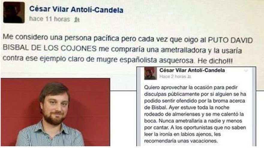 Vilar aseguraba en su cuenta de Facebook: “Me considero una persona pacífica pero cada vez que oigo al Bisbal de los cojones me compraría una ametralladora y la usaría contra ese ejemplo claro de mugre españolista asquerosa”.